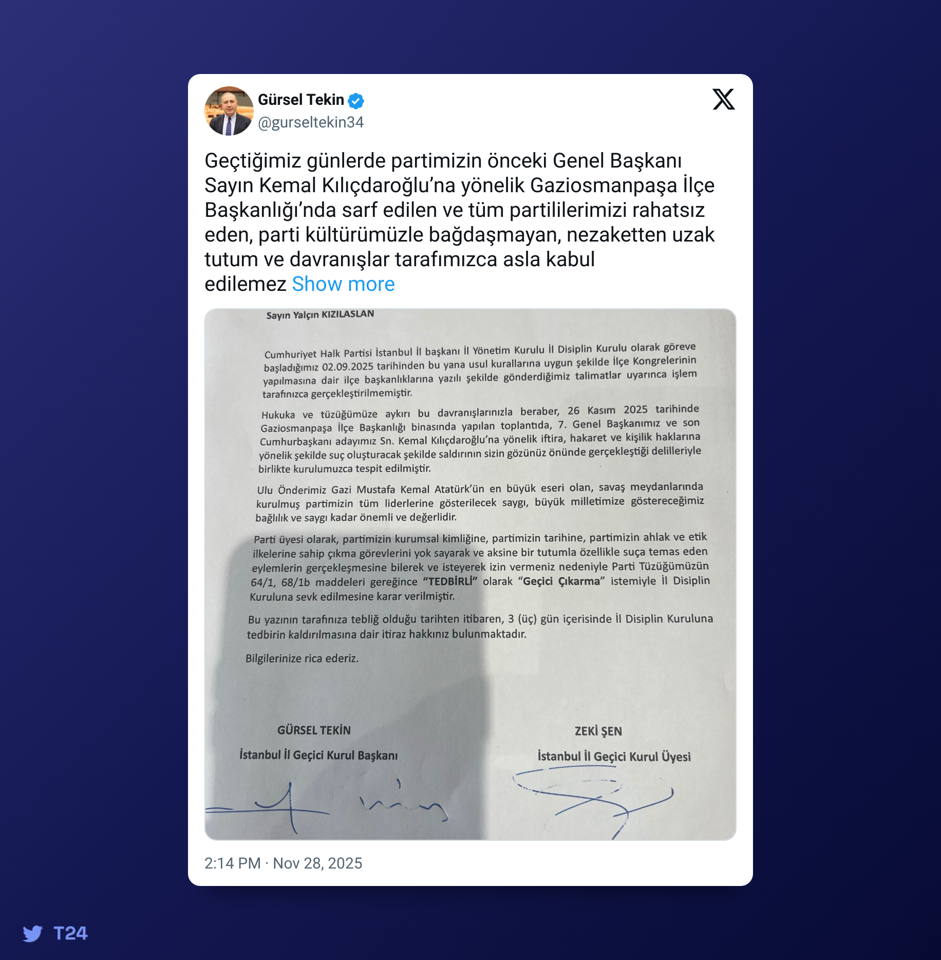 “İstanbul İl Başkanlığı Geçici Kurulu olarak, bu tür davranışların parti ahlakı, geleneği ve tüzüğümüzle bağdaşmadığı açıktır. Bu nedenle, ilgili kişi hakkında gerekli işlemler ivedilikle yapılmış ve süreç tüzüğümüzün hükümleri doğrultusunda işletilmiştir.”